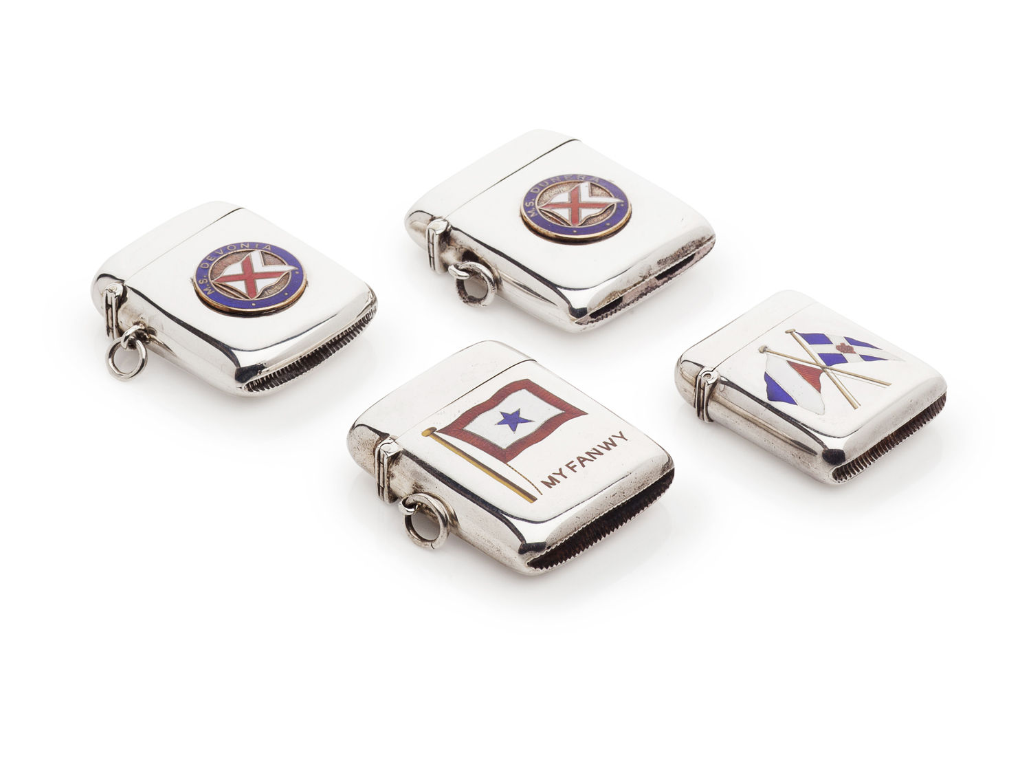 all of traditional shape; William Neale., Chester 1903, later applied enamelled badge for MS Devonia: another CS*FS., Birmingham 1904, later applied enamelled badge for the MS Dunera; another D&F, Birmingham 1891, with two crossed enamelled flags; the last ?C, Chester 1908, coloured enamelled flag for the Blue Star