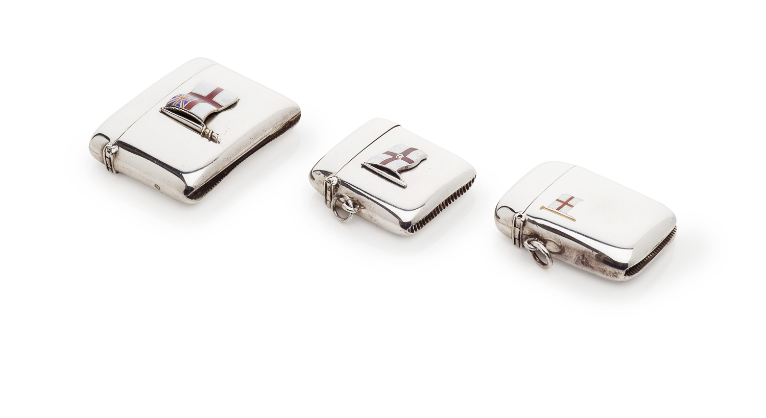 of traditional curved form; Miller Bros, Birmingham 1906 with applied silver and enamelled flag for the Shipwrecked Fisherman and Mariners Royal Benevolant Society; the second Joseph Gloster, Birmingham1901, enamelled flag, engraved to rear HMS Renown Tug of War 1902; a divided Vesta case T & J Bragg, Birmingham 1900, applied silver and enamel white ensign (3)