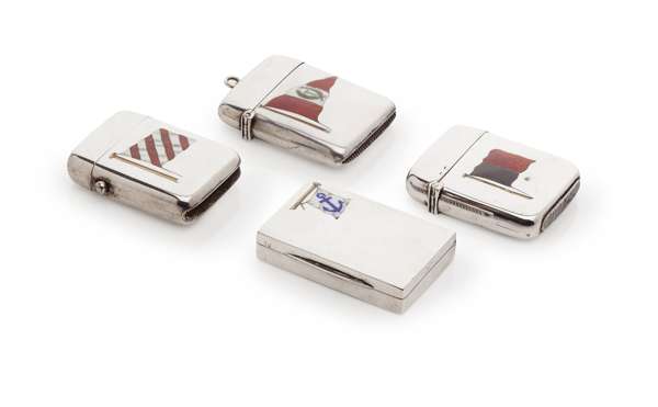 of traditional form; George Unite, Birmingham 1902, retailed by Benzies Cowes, enamelled flag, red and white diagonals; Birmingham 1896, burgee with red and white stripe and laurel motif; TR&S, Glasgow, 1891, with a black and red flag; a snuff box, WN, Sheffield 1897, of plain rectangular form, enamel flag of blue anchor on white ground (4)