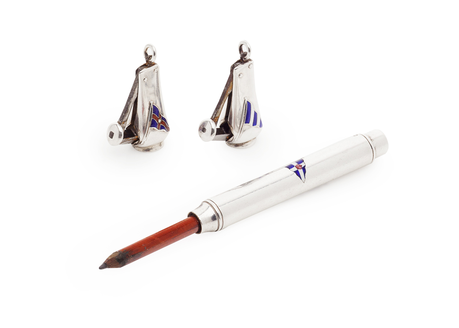 the pencil, Samuel Mordan & Co. London 1928, enamelled burgee for The Royal Thames Yacht Club; the two small prickers marked sterling, steel actions, decorated with enamelled burgees, New York Yacht Club and Larchmont Yacht Club