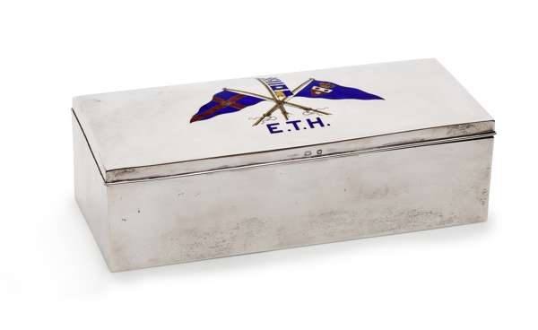 Deakin and Francis, Birmingham 1896, of rectangular form, slight domed lid, enamelled crossed burgees for Royal Southern Yacht Club, and Royal Southampton Yacht Club also signal flags to read NJPK also enamelled initials E.T.H., cedar lined interior