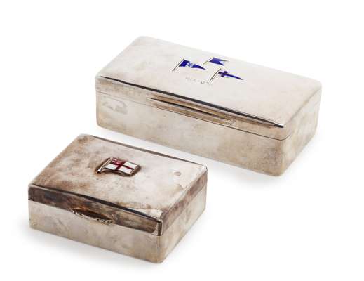 Goldsmiths and Silversmiths Company, London 1920, of rectangular form, slight domed hinged cover, enamel flag for a Rear Admiral and two burgees, also engraved KIA-ORA; a smaller cigarette box, Deakin & Francis Birmingham 1954, of rectangular form, the slightly domed hinged cover with applied White Ensign