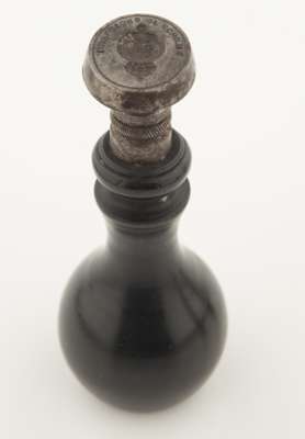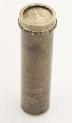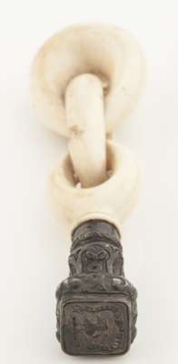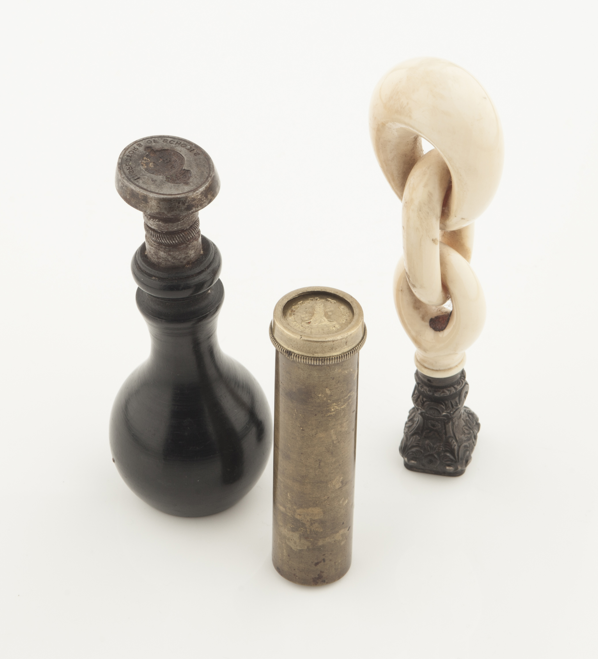 the carved ivory handle of three interlinked ovals with white metal matrix with crest and motto; with a steel desk seal with crest and inscribed 'INSPECTOR OF SCHOOLS' with turned wooden handle; together with a brass tube containing twenty five double sided interchangeable seal matrices (3)