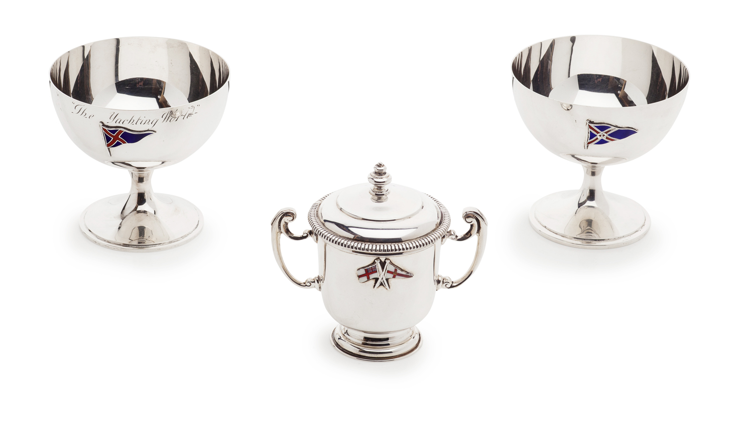Robert Pringle, London 1932, a pair of saucer trophies, engraved "The Yachting World" applied burgee for Motor Yacht Club, the other plain and with enamel burgee for The Royal Motor Yacht Club; together with a small lidded trophy, William Neale Birmingham 1937, of classic vase shape, domed cover, turned finial, gadroon edge, the body with crossed White Ensign and burgee for The Royal Yacht Squadron, engraved inscription ".... Regatta Cowes, ..... 1938 Thora 2nd Prize" (3)
