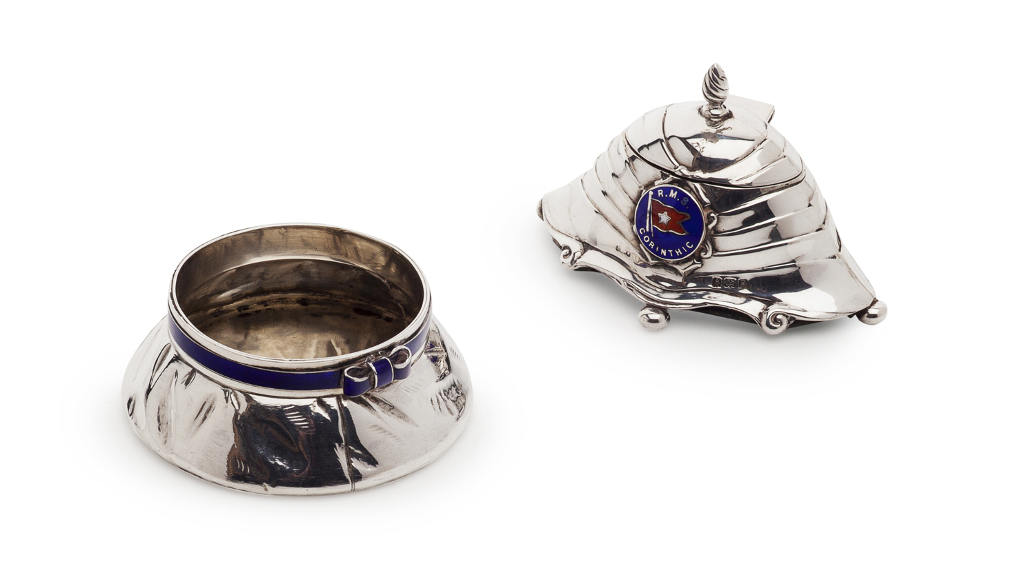 Marshall and Co., Birmingham 1906, modelled as a stepped oval lidded inkwell, wrythen finial, applied brass and enamel badge for RMS Corinthic; William Summers, London 1896, a silver and enamel pin tray modelled as a sailor's hat, blue and gilt enamel band inscribed HMS Imperieuse (2)