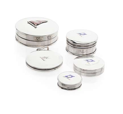 the mirror, Lawrence Emanuel, Birmingham 1903, of circular form, swivel cover with enamelled swallow tail burgee for the Royal Yacht Squadron; a large table box and removable cover, Charles & Richard Comyns, London 1917, the cover with applied silver and enamelled flag pole and burgee for The Royal Norfolk and Suffolk Yacht Club; a group of three circular boxes and covers, each with enamel flag for the A Holt shipping line, two engraved, each with tss Patroclus and tss Sarpendon