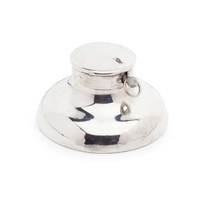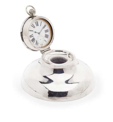 Birmingham 1908, of circular form, of capstan style, the hinged lid lifting to reveal a white faced watch and glass insert inkwell.