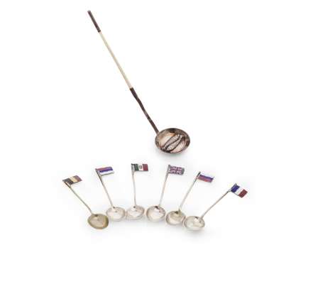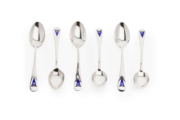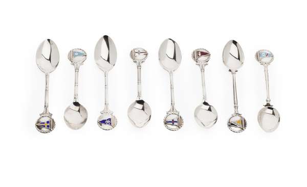 Turner and Simpson, Birmingham 1960, a set of eight souvenir spoons each with differing silver and enamel burgees on finials; Barker Brothers Ltd., Birmingham 1935, a set of six spoons, each with an enamel burgee; with various others. (21)