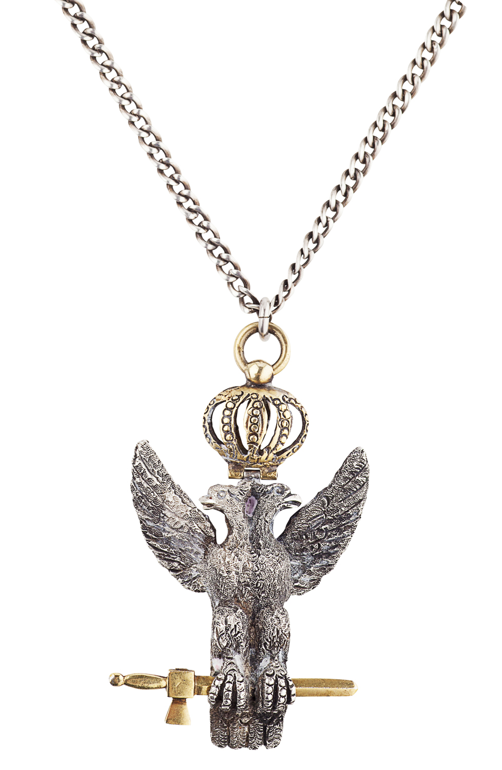 a jewel of the Thirty-third Degree, or Sovereign Grand Inspector-General of the Ancient and Accepted Scottish Rite, apparently unmarked, modelled as a cast double headed eagle with crown and holding a dagger in its claws, chain suspension