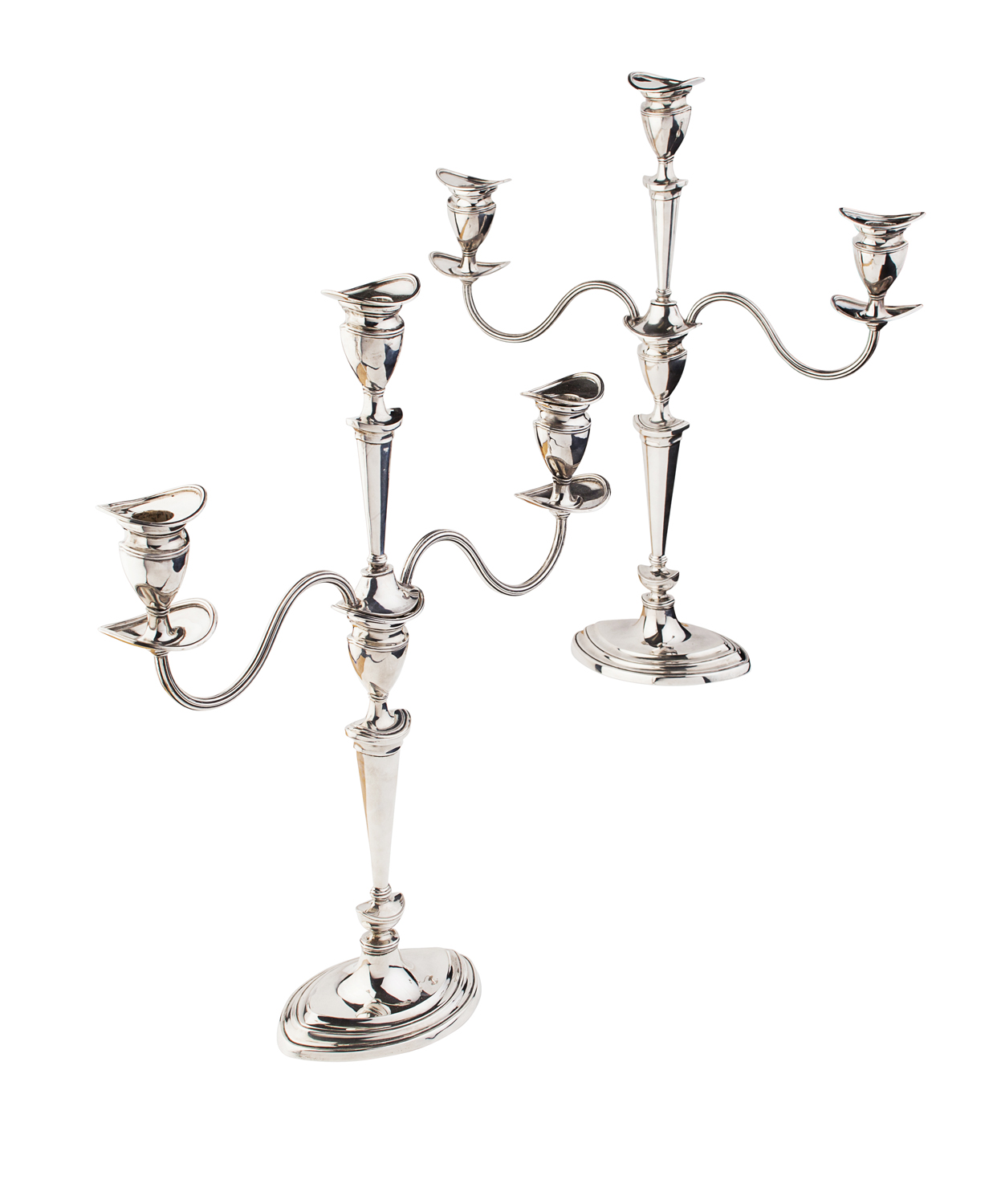 Hamilton & Inches, Edinburgh 1883, the tapered columns with urn shaped sconce with central upper column and twin reeded scrolling arms, the whole raised on a simple domed oval base (2)