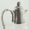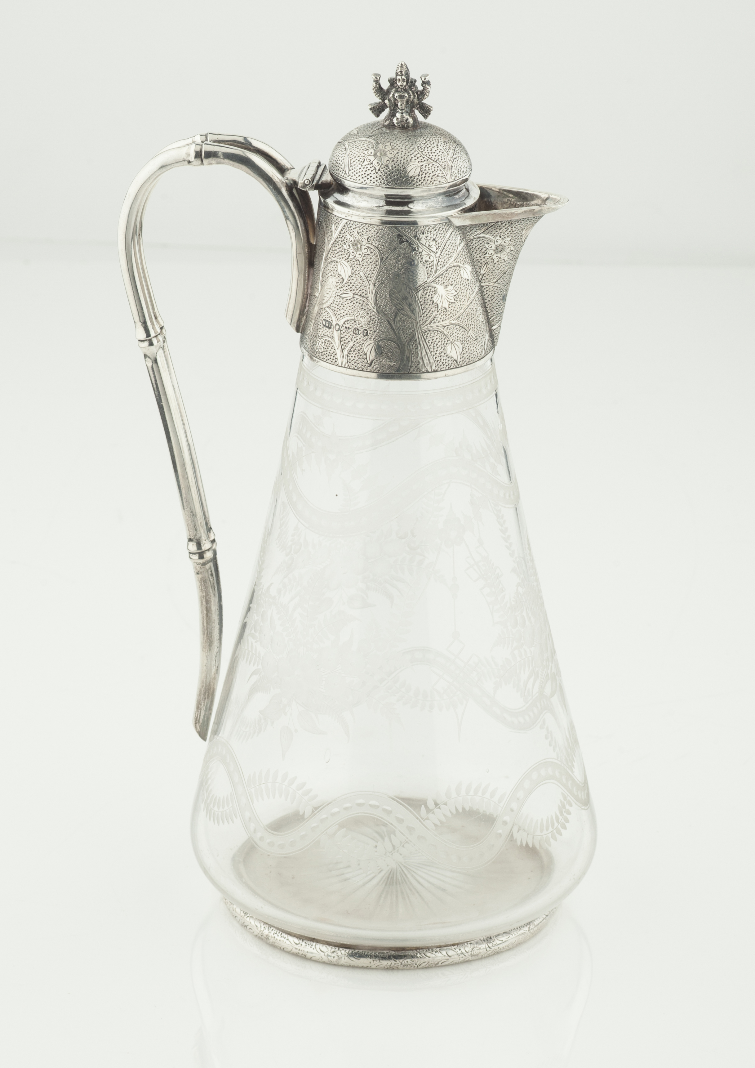 Hamilton & Inches, Edinburgh 1875, the flared glass body with engraved borders, interlaced floral garlands and displays, the silver neck and spout with engraved birds within trees, all on a textured background, the hinged lid with cast finial, with C scroll bamboo formed silver handle