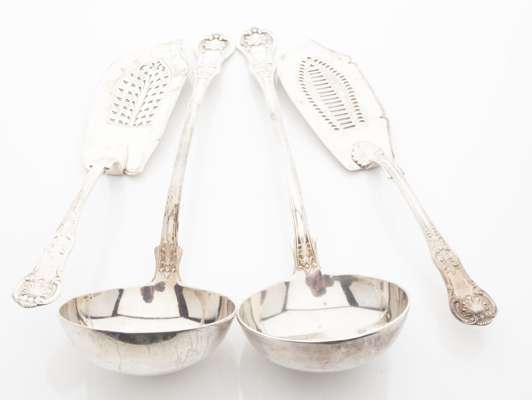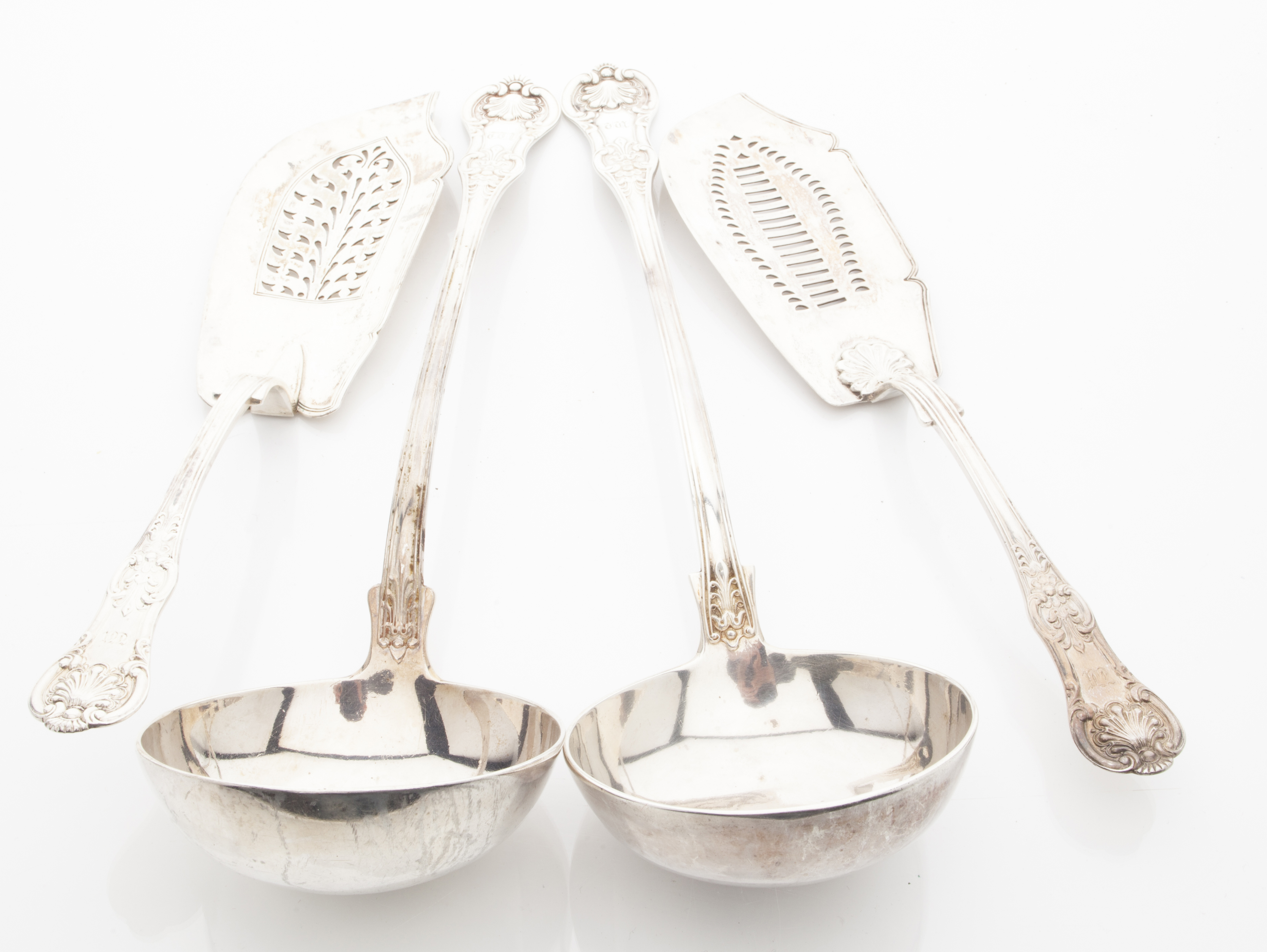 Two similar Scottish fish slices and soup ladles