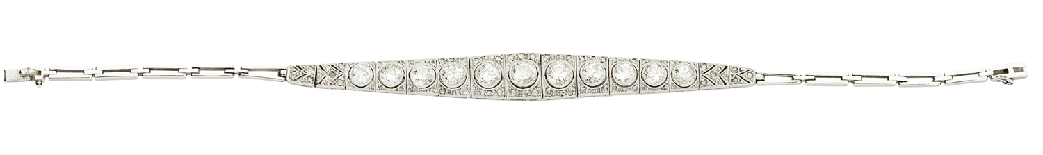 the tapering articulated central section set with eleven millegrain circular cut diamonds on diamond pave set links, to a flexible polished sprung bracelet, snap clasp with safety catch