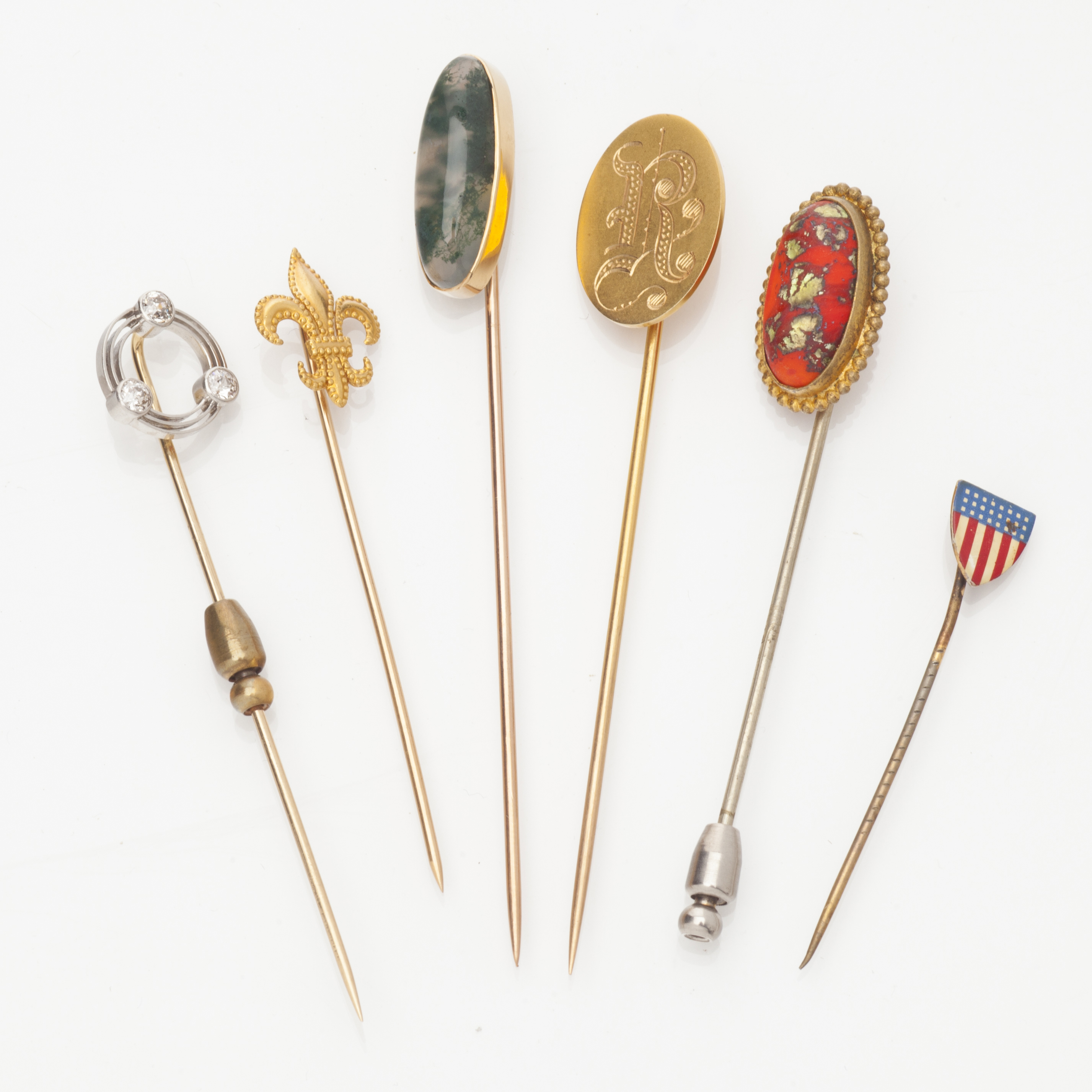 to include a moss agate set example, another with yellow metal fleur de lis design; another with an oval terminal with engraved initial 'R'; a diamond set example, another with enamel detail, and a further gem set example (6)
