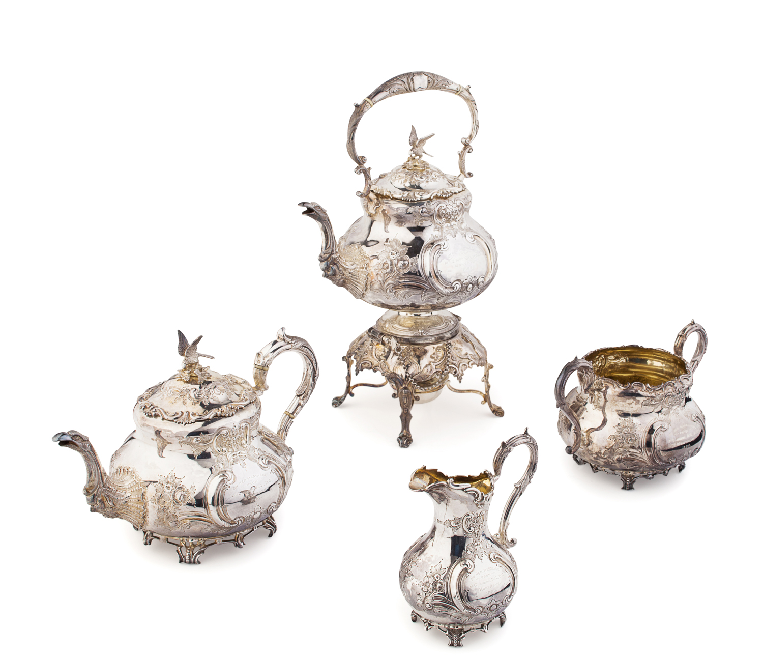Martin & Hall, Sheffield 1895 and 1896, comprising spirit kettle and stand, teapot, twin handled sugar bowl and milk jug, each of baluster form with embossed rococo scrolls and foliate display, with curved spouts / handles and eagle finials to cover, each with engraved monogram and presentation inscription (4)