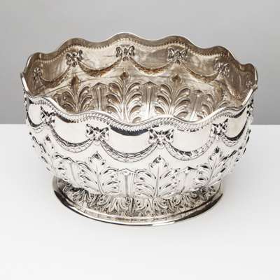 Sibray, Hall & Co, Sheffield 1887, of circular outline with scalloped rim chased swag and acanthus leaf detail, to a swept circular foot of similar decoration
