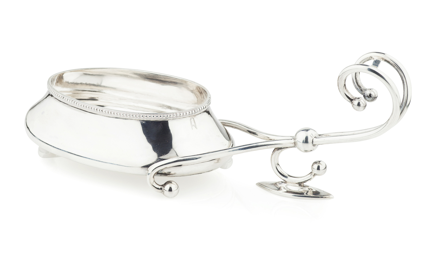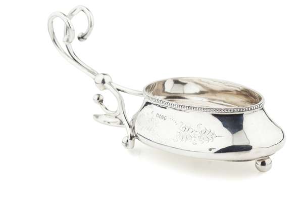 Martin and Hall, London 1881, the oval bowl with beaded border, engraved fern design, scroll arms and support, ball detail and feet