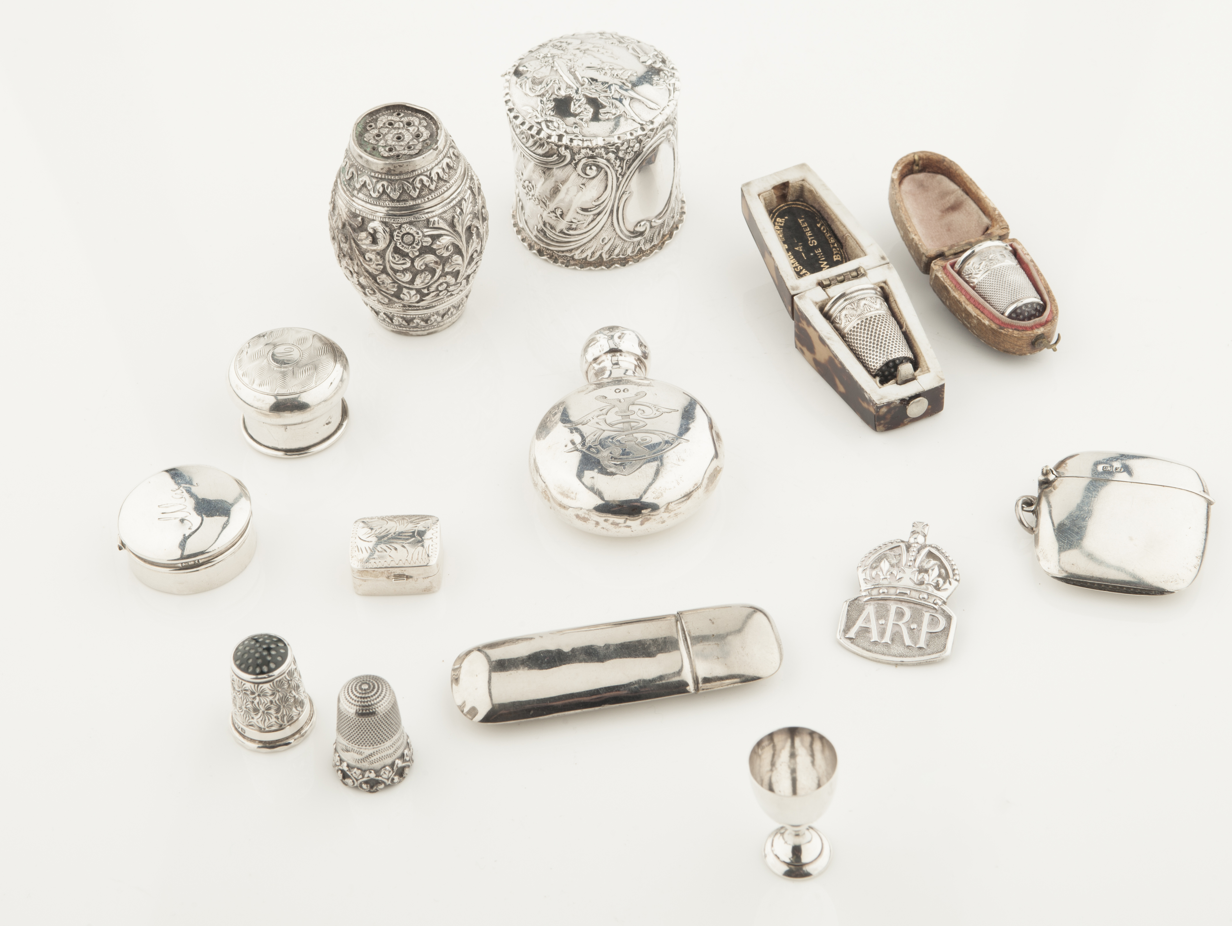 to include a small Victorian scent flask of circular outline with engraved initials; four thimbles, two cased; a miniature chalice; a small table box of circular outline, with embossed foliate and figural detail; a white metal pepper pot, with floral detail to body; various other boxes, lids and badges (qty)