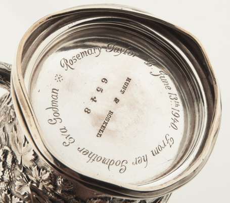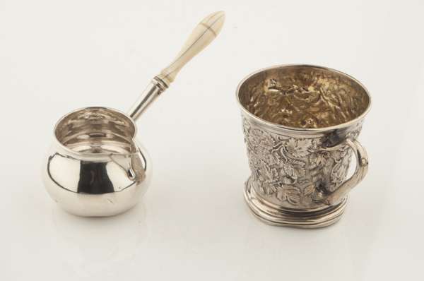 H W & Co, London 1836, of conventional form with turned ivory handle; together with a Victorian mug, of circular outline with chased foliate detail throughout, cartouche with engraved initials, London 1873 (2)