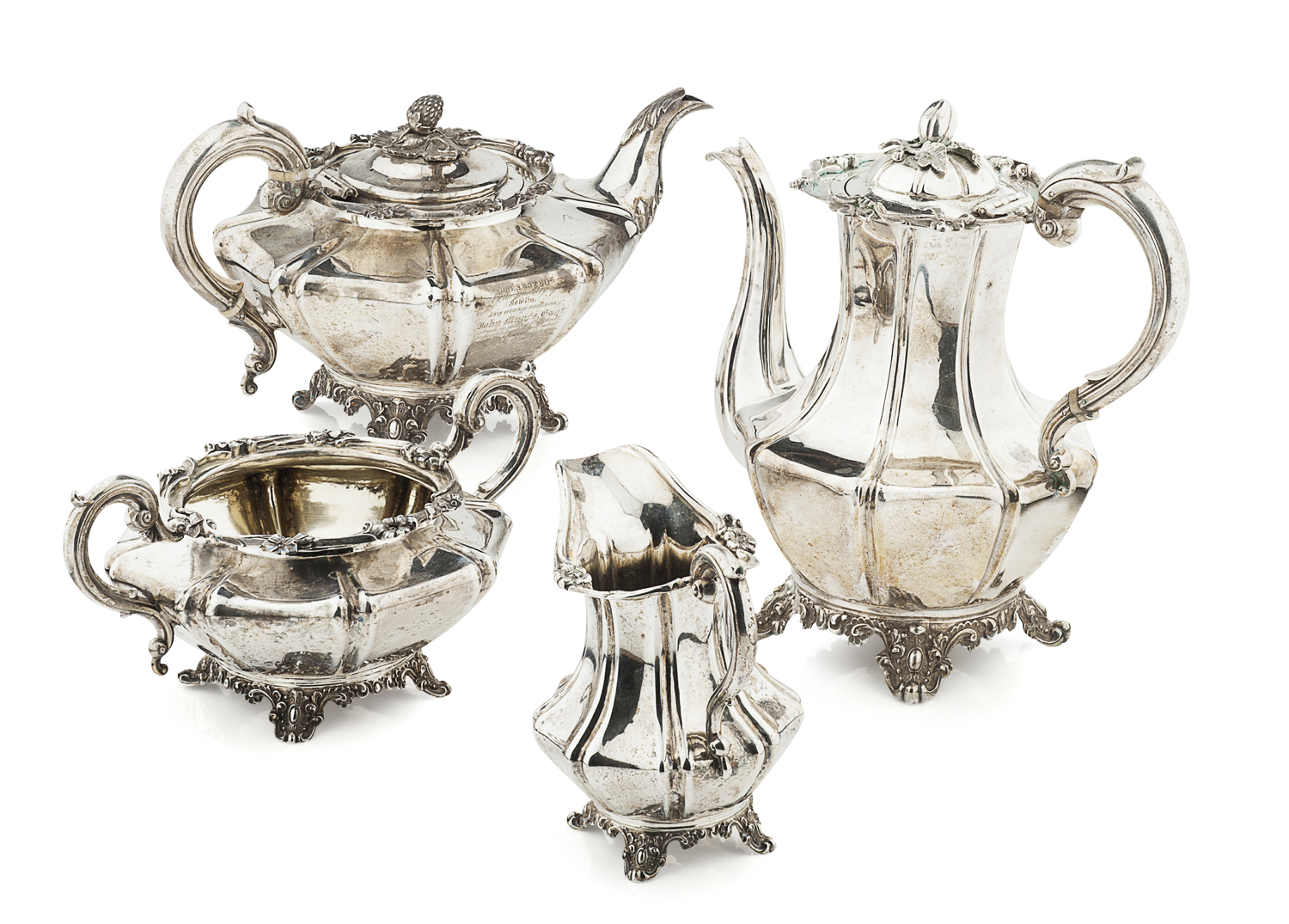 PB, London 1836, comprising a teapot, sugar and cream, of panelled pear shape form, cast floral border, scrolling handles and leaf clasped spout, cast bracket feet, with a similar coffee pot, WH, London 1844, the tea and coffee pot with presentation inscriptions (4)