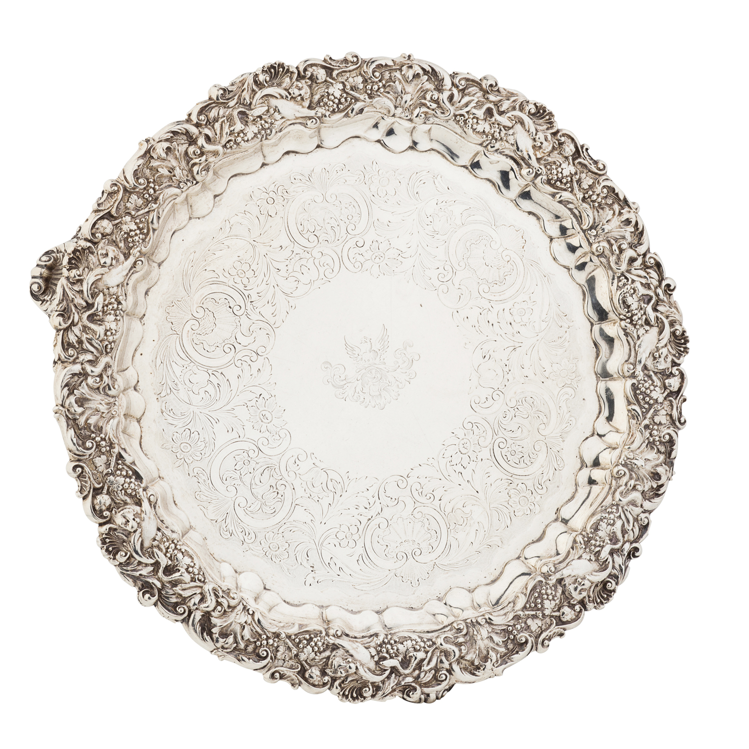 R Hennell, London 1834, of circular outline with large fruiting vine border and engraved scrolls and foliage, engraved crest to centre, raised on shell bracket feet