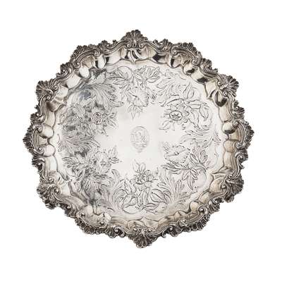 Charles Fox, London 1833, of shaped circular outline with cast scroll and shell border, the centre engraved with trailing foliage and engraved crest, raised on three scroll bracket feet