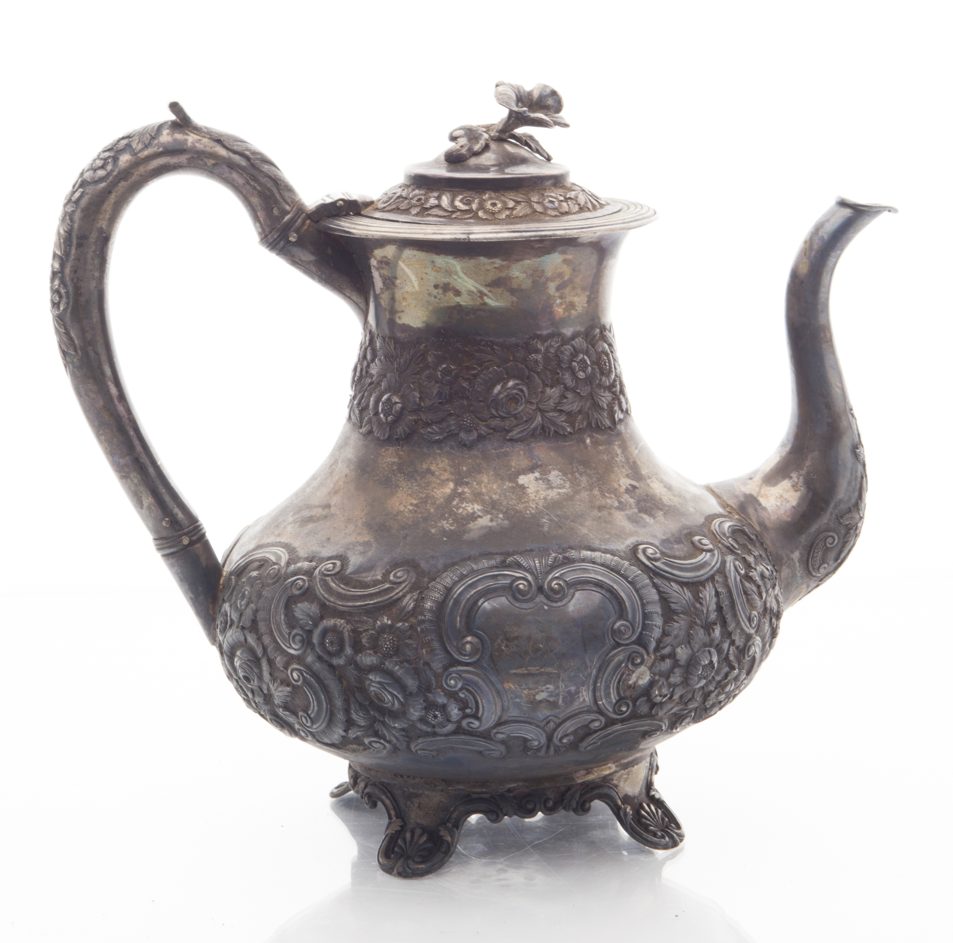IOL, Dublin 1829, of baluster form, threaded rim, floral finial, C scroll and foliate decorated body, floral clasped spout, cast feet