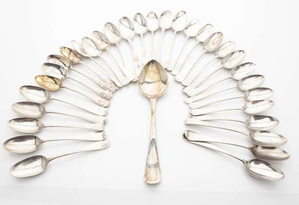 primarily London 18th century, marks variable, decoration ranging from simple shell motif to a bird on a lake, some engraved initials