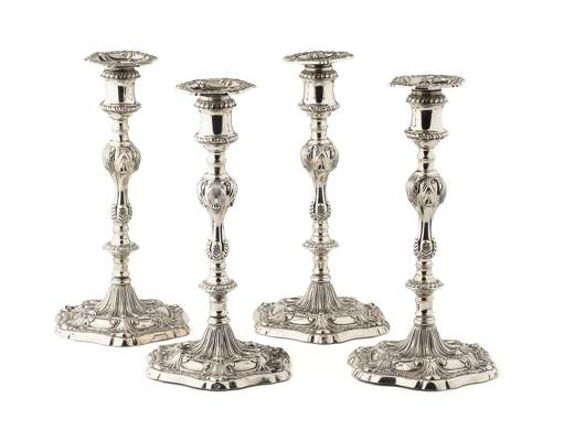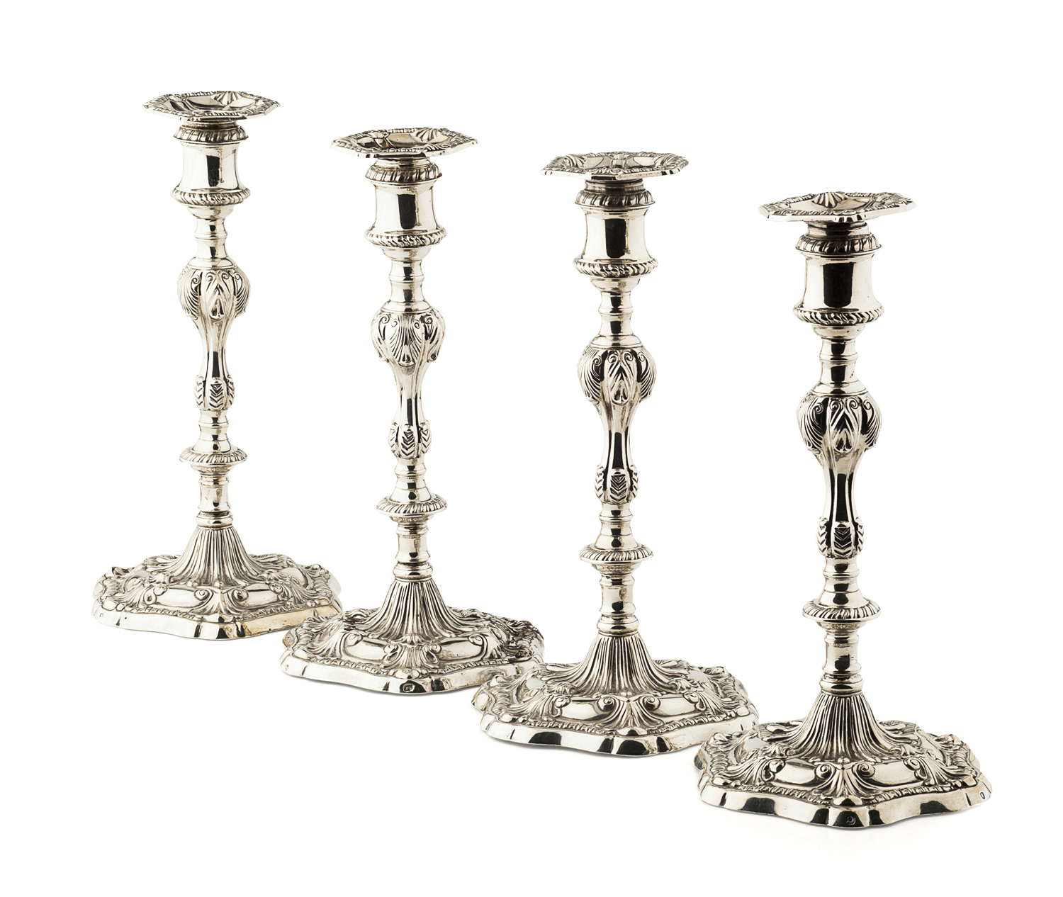 WT, London 1759, the tapered knopped stem with foliate fluting and gadrooned knops, on a domed and spreading shaped circular base with shell and scroll details, with loaded wooden bases (4)