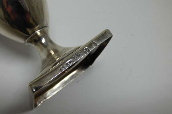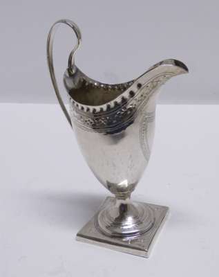 Hester Bateman, London 1790, of helmet form, bright cut engraved border, blank cartouche, plain scroll handle, square base, slight pricked decoration