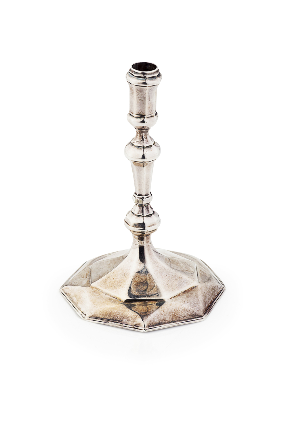John Barnard I, London 1712, the tapered knoped stem with simple socket sconce, raised on a two stage octagonal base, with engraved scratch weight to underside of foot