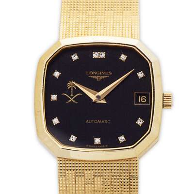 black square dial, canted corners, plain bezel, diamond numerals, subsidiary date aperture, gilt Saudi Royal Arms detail, automatic movement, numbered to rear, 18479595, screw down rear cover