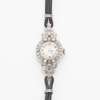 the small circular dial with Arabic numerals, the bezel set in white metal with small round cut diamonds, with similarly set scrolling detail to top and bottom, to a plain leather strap