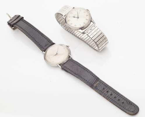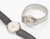 the matt off white dial with bright polished baton numerals and hands, sweep second hand and marked Super Precision, movement number E43466, rear snap off back numbered 4222, plain polished case, leather strap, dial diameter, 30mm, together with OMEGA - A gentleman's stainless steel cased wrist watch, off white dial, Arabic numerals, sweep second hand, movement numbered 9825233
