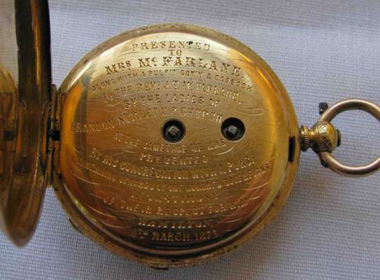 open faced, key wind, engraved rear cover, enamel dial, engraved cuvette with presentation inscription relating to Rev and Mrs McFarlane of Hamilton 1873, open lever movement