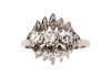 claw set with three graduated round brilliant cut diamonds, in a radiating border set with smaller round cut diamonds, to a plain white metal shank stamped 18CT