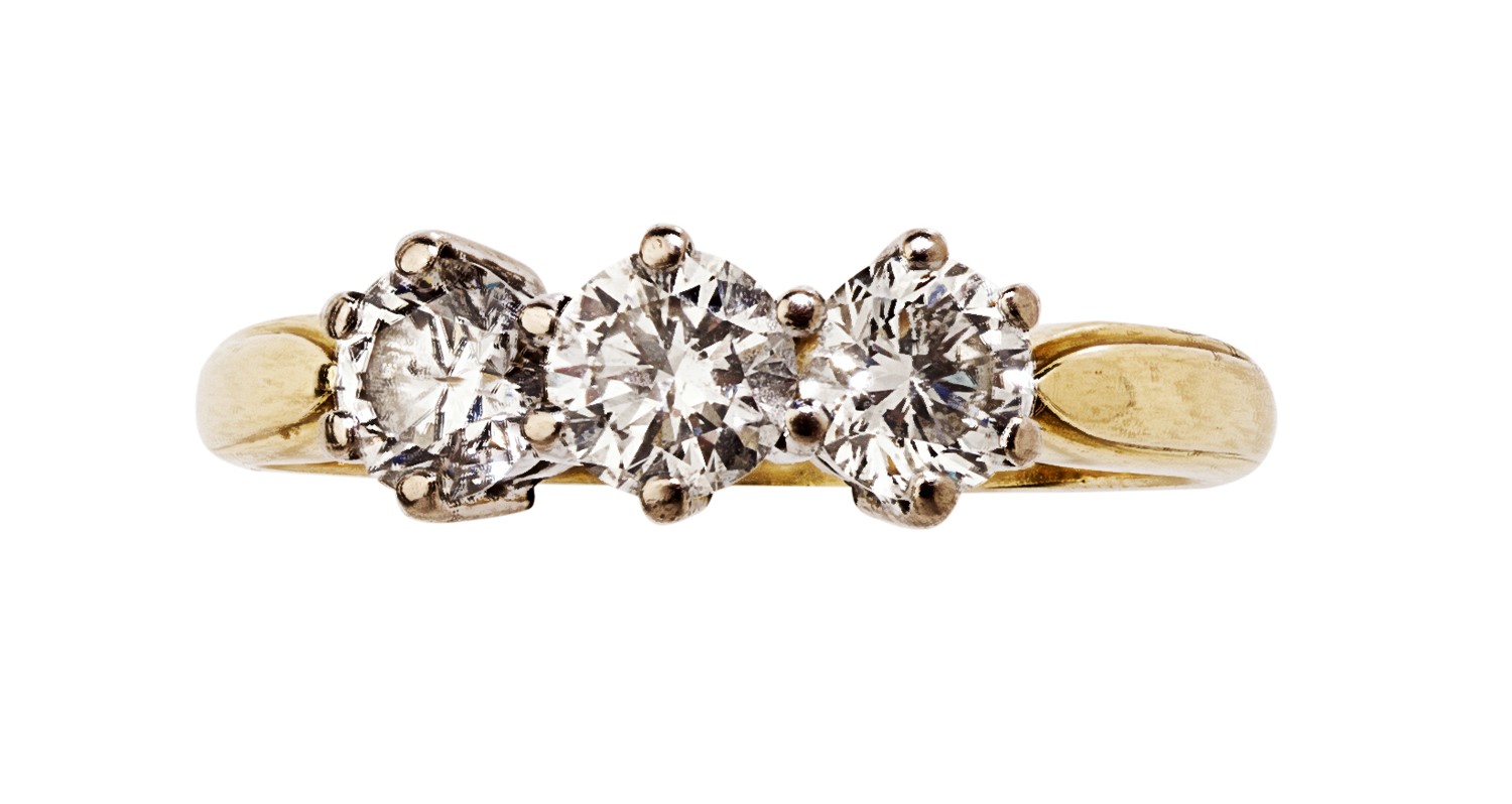 claw set with three round brilliant cut diamonds, to a plain 18ct gold shank