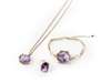 to include an oval cut amethyst cocktail ring, the plain shank stamped 18ct; an hexagonal amethyst and seed pearl set pendant to a yellow metal fancy link chain; an hexagonal amethyst and seed pearl set bracelet, the cluster to an expandable yellow metal chain, stamped 15CT (3)