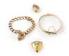 to include a 9ct gold curb link bracelet with padlock clasp; a 9ct gold bangle of plain design; a 9ct gold oval locket with engraved detail and a silver gilt presentation badge (4)