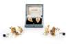 each of graduated stylized pagoda design, modelled in unmarked yellow metal, with post and butterfly fittings; together with a pair of abstract blister pearl set earrings, of scrolling form with fringed drops, unmarked; a pair of lapis lazuli ball earrings; a pair diamond set leaf formed earrings, modelled in unmarked yellow metal (4)