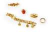 to include a yellow metal opal set scarf clip with character mark detail, stamped PC 22; a carved coral set ring with character mark to shank; a yellow metal brooch of floral and horseshoe set design, stamped WL 20 character mark; a yellow metal band; a yellow metal bracelet, the circular links with character mark detail, some with similar pendant links (5)