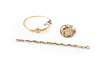 of circular outline with pierced Celtic pattern, together with a yellow metal and seed pearl set bangle and an expandable gilt metal bracelet (3)