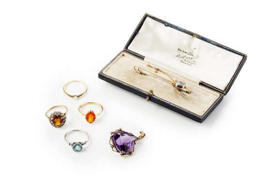 to include a 9ct gold amethyst set pendant; a seed pearl set ring; an aquamarine set bar brooch; a zircon set ring; a fire opal set ring; a citrine and paste set ring (6)
