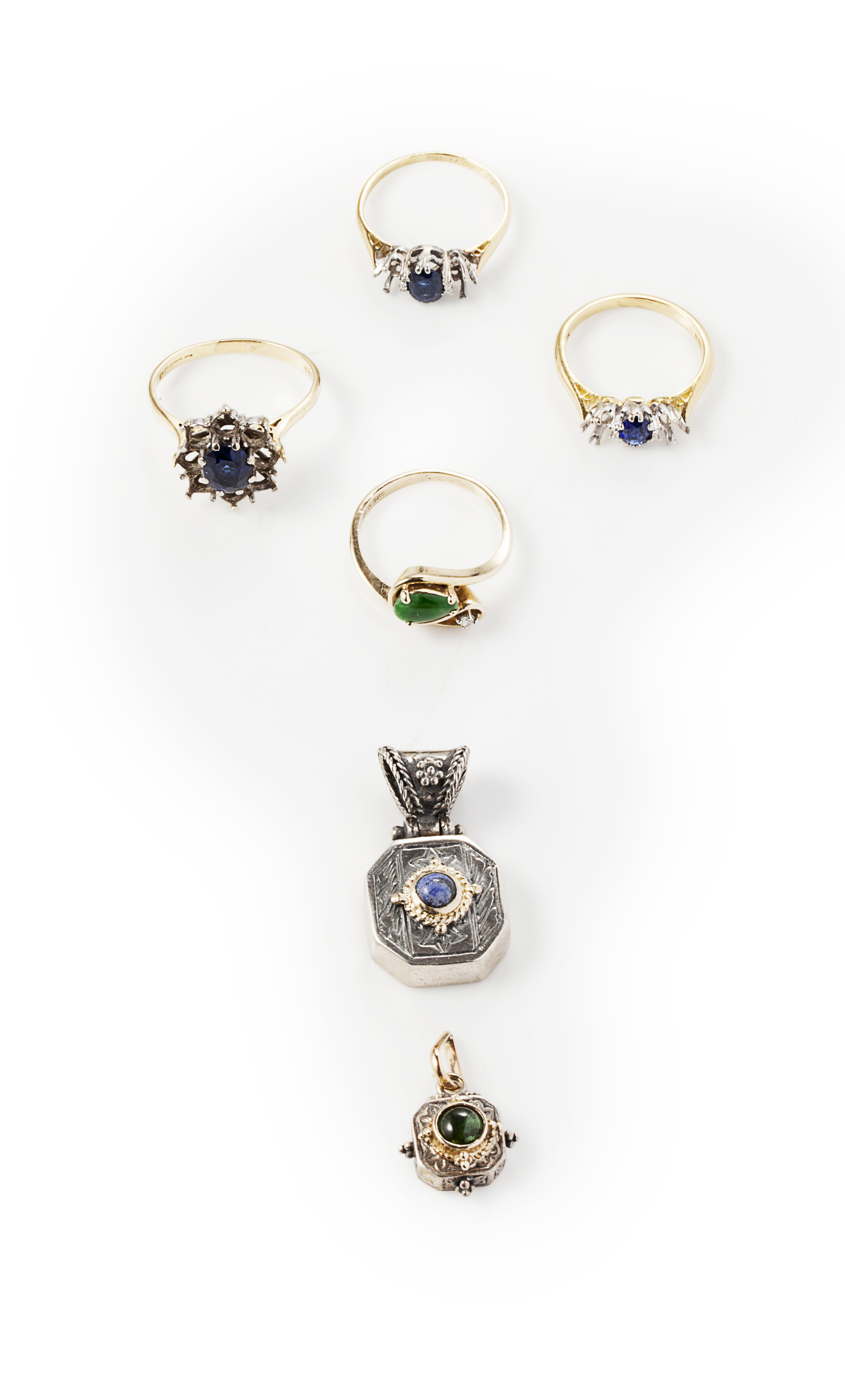 to include three gold and sapphire set ring mounts (other gems deficient), a jade and diamond set ring; and two white metal and hardstone set pendants (qty)