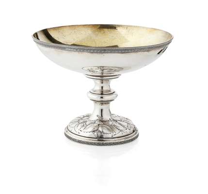 marked Tiffany 484 6122, English Sterling 925 1000, of comport shape, Greek key and gadroon border, gilt bowl, knopped stem, leaf decorated spreading foot