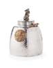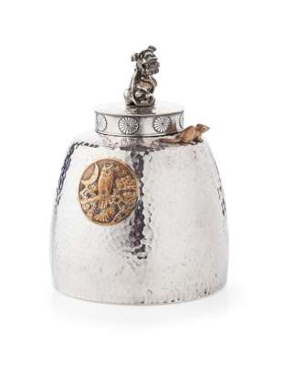 marked Sterling, 91L, of planished skep form the pull off cover with shi-shi lion finial, chased rosette border, a mouse in copper to the rim, inset copper disc with owl, and an applied silver bullrush to the side