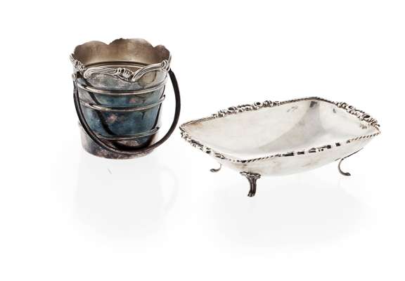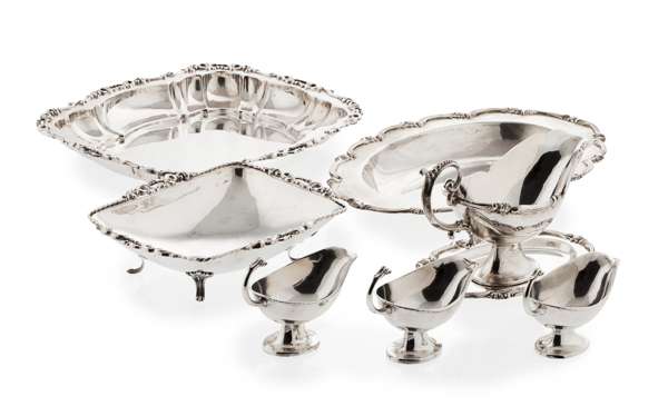 marked Camusso and including; a rectangular serving dish, moulded border; a smaller similar pedestal dish; an oval serving dish; a large sauce boat and plate; THREE small sauce boats; a rectangular dish; a small ice bucket, all with variously decorated moulded rims (qty)