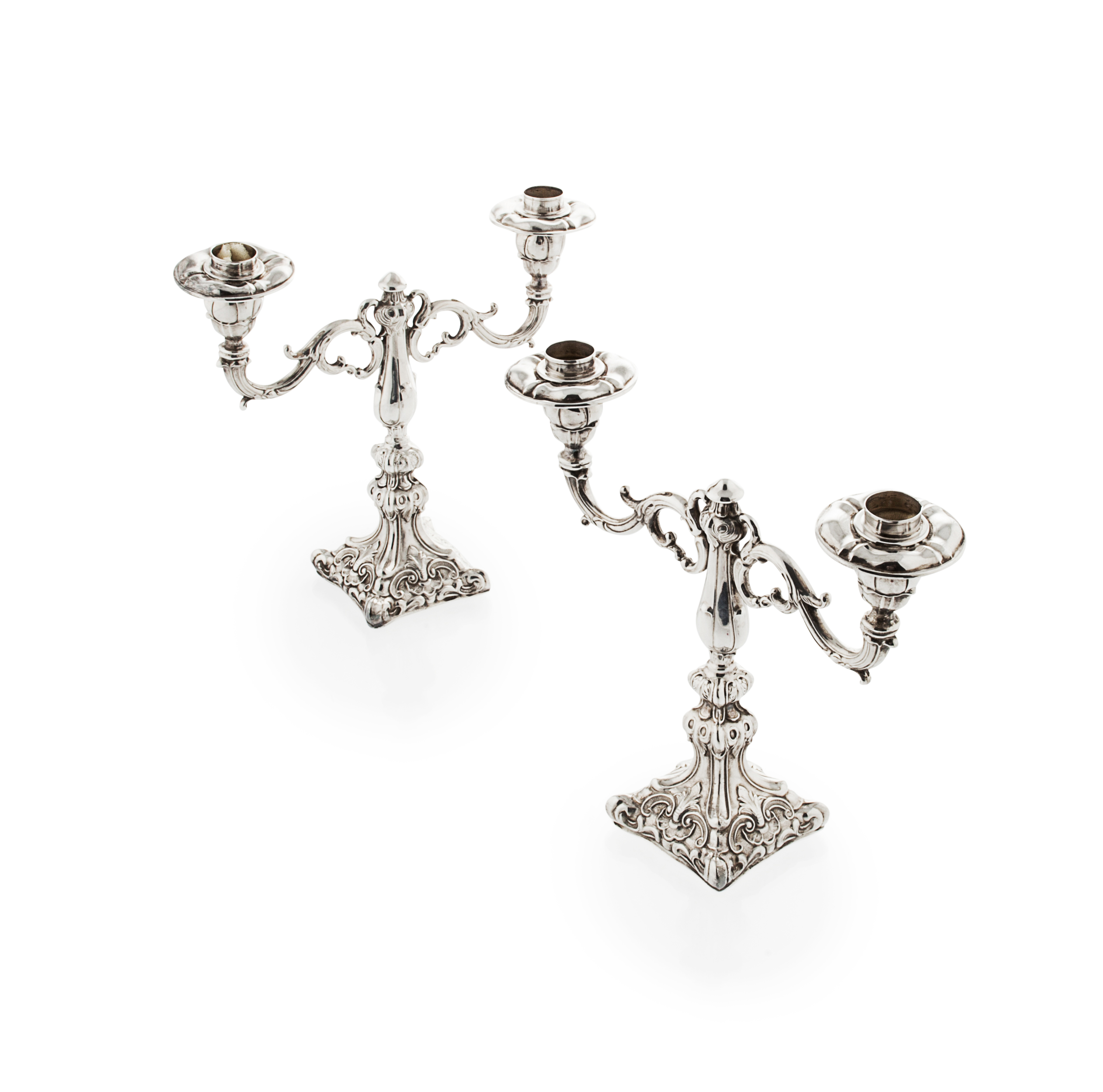 marked Camusso, Sterling 925, of hollow form, scrolling branches, lobed sconces, leaf decorated knopped stem, shaped decorated square base