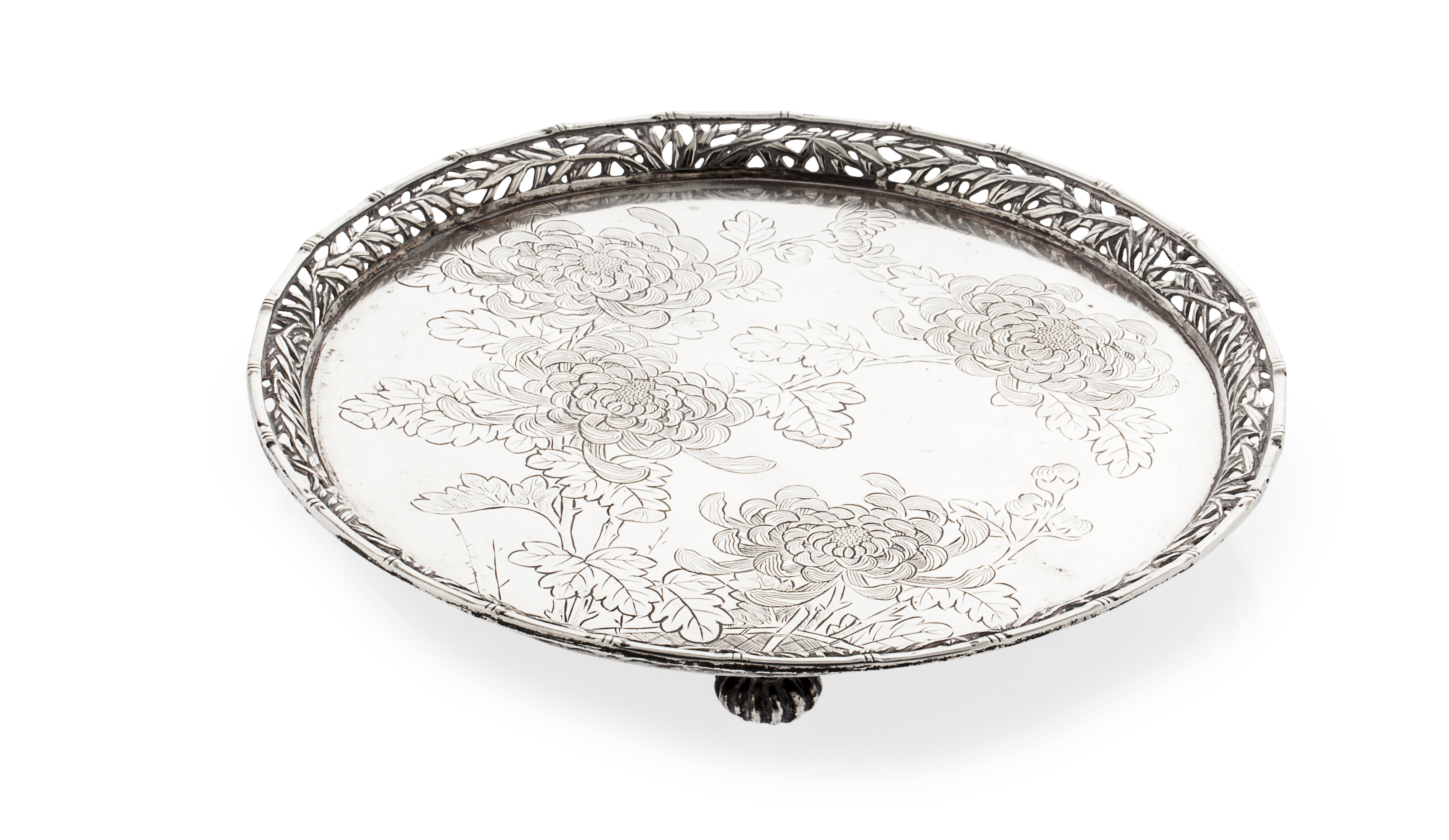 Wang Hing, Shanghai, circa 1880, of circular form, simulated pierced bamboo border, engraved flat, raised on reeded disc feet