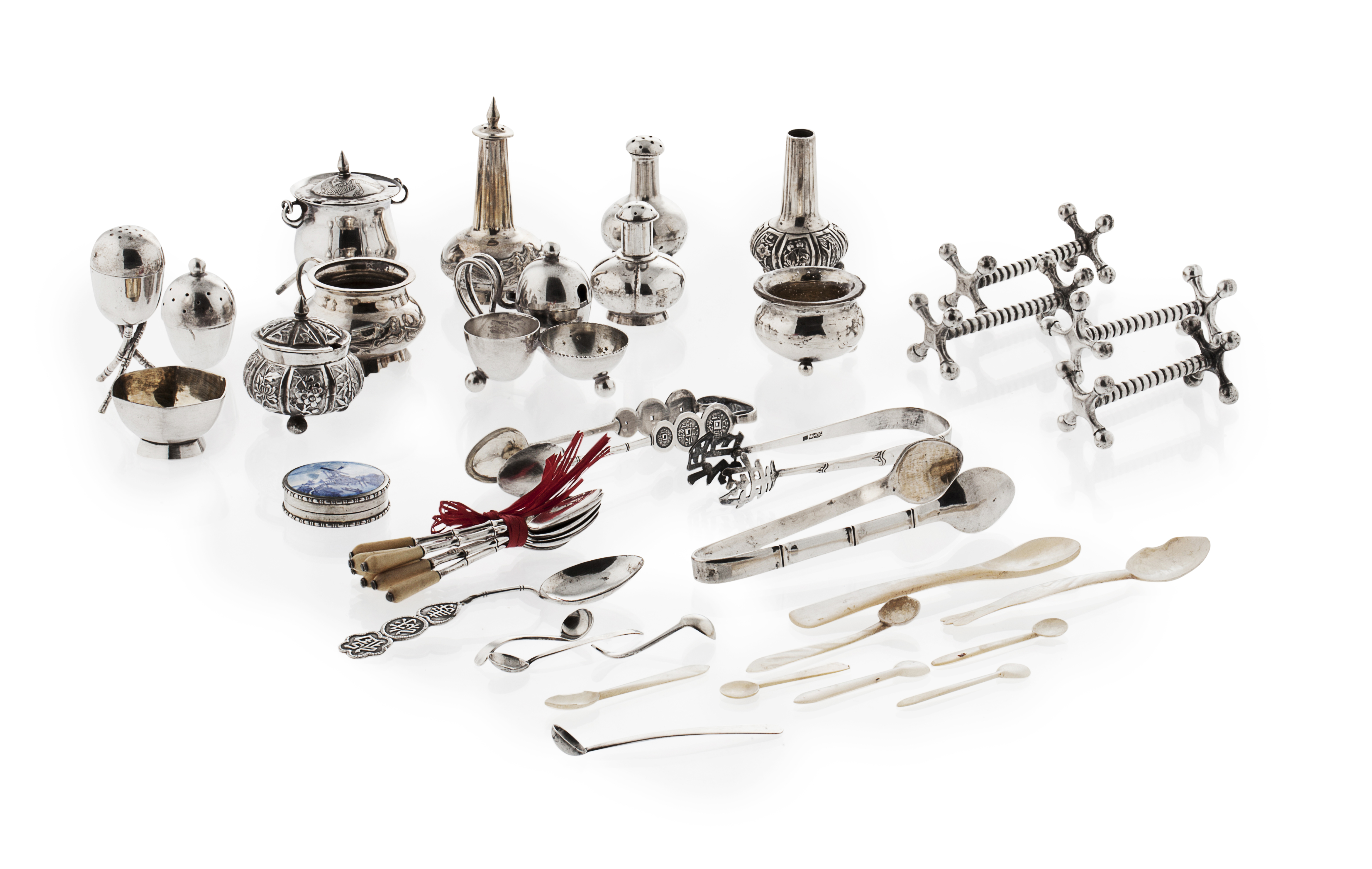 Various makers, some unmarked, various designs and decoration, comprising; mustards; salts; pepperettes; small patch box; small spoons with simulated bamboo handles; various sugar tongs; odd spoons etc; set of plated carver rests; mother of pearl egg spoons etc. (qty)